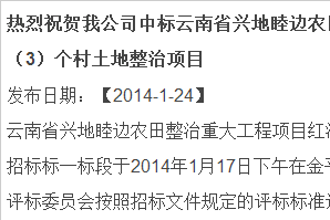 熱烈祝賀我公司中標(biāo)云南省興地睦邊農(nóng)田整治重大工程項(xiàng)目紅河州金平縣阿哈迷等(3)個(gè)村土地整治項(xiàng)目 發(fā)布日期:【2014-1-24】 云南省興地睦邊農(nóng)田整治重大工程項(xiàng)目紅河州金平縣阿哈迷等(3)個(gè)村土地整治項(xiàng)目施工招標(biāo)標(biāo)一標(biāo)段于2014年1月17日下午在金平苗族瑤族傣族自治縣國(guó)土資源局依法公開(kāi)招標(biāo),評(píng)標(biāo)委員會(huì)按照招標(biāo)文件規(guī)定的評(píng)標(biāo)標(biāo)準(zhǔn)進(jìn)行評(píng)審,2014年1月24日確定中標(biāo)