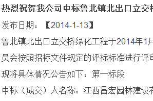 熱烈祝賀我公司中標(biāo)魯北鎮(zhèn)北出口立交橋綠化工程 發(fā)布日期:【2014-1-13】 魯北鎮(zhèn)北出口立交橋綠化工程于2014年1月13日下午在扎魯特旗林業(yè)局依法公開(kāi)招標(biāo),評(píng)標(biāo)委員會(huì)按照招標(biāo)文件規(guī)定的評(píng)標(biāo)標(biāo)準(zhǔn)進(jìn)行評(píng)審,2014年1月16日確定中標(biāo)(成立)人。 現(xiàn)將具體情況公告如下:第一標(biāo)段