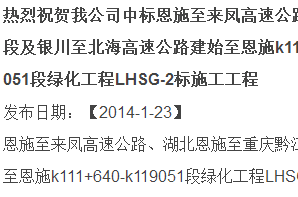 熱烈祝賀我公司中標(biāo)恩施至來(lái)鳳高速公路、湖北恩施至重慶黔江高速公路宣恩至咸豐段及銀川至北海高速公路建始至恩施k111+640-k119 051段綠化工程LHSG-2標(biāo)施工工程 發(fā)布日期:【2014-1-23】