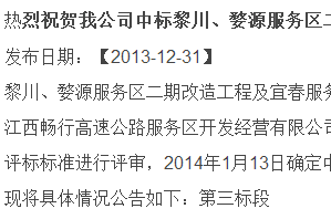熱烈祝賀我公司中標(biāo)黎川、婺源服務(wù)區(qū)二期改造工程及宜春服務(wù)區(qū)衛(wèi)生間改擴(kuò)建工程 發(fā)布日期:【2013-12-31】 黎川、婺源服務(wù)區(qū)二期改造工程及宜春服務(wù)區(qū)衛(wèi)生間改擴(kuò)建工程于2013年11月28日下午在江西暢行高速公路服務(wù)區(qū)開(kāi)發(fā)經(jīng)營(yíng)有限公司依法公開(kāi)招標(biāo),評(píng)標(biāo)委員會(huì)按照招標(biāo)文件規(guī)定的評(píng)標(biāo)標(biāo)準(zhǔn)進(jìn)行評(píng)審,2014年1月13日確定中標(biāo)(成立)人