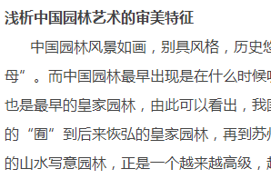 淺析中國園林藝術(shù)的審美特征 中國園林風(fēng)景如畫,別具風(fēng)格,歷史悠久,是東方園林的典范,被譽為“世界園林之母”。而中國園林最早出現(xiàn)是在什么時候呢?中國園林最早的形態(tài)是殷商時期的“囿”,這也是最早的皇家園林,由此可以看出,我國的園林式一直在發(fā)展并完善著的,從最古老的“囿”到后來恢弘的皇家園林,再到蘇州園林這樣鐘靈毓秀的私家園林,最后是如詩如畫的山水寫意園林,正是一個越來越高級,越來越自然的演變的過程。而后無疑問,