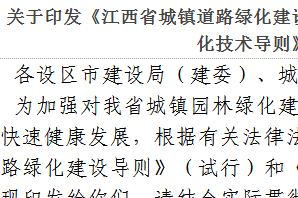 關(guān)于印發(fā)《江西省城鎮(zhèn)道路綠化建設(shè)導(dǎo)則》(試行)和《江西省城鎮(zhèn)立體綠化技術(shù)導(dǎo)則》(試行)的通知 各設(shè)區(qū)市建設(shè)局(建委)、城管局,南昌市、撫州市園林綠化局: 為加強對我省城鎮(zhèn)園林綠化建設(shè)管理工作的指導(dǎo),促進城鎮(zhèn)園林綠化事業(yè)快速健康發(fā)展,根據(jù)有關(guān)法律法規(guī)和標(biāo)準(zhǔn)規(guī)范,我廳制訂了《江西省城鎮(zhèn)道路綠化建設(shè)導(dǎo)則》(試行)和《江西省城鎮(zhèn)立體綠化技術(shù)導(dǎo)則》(試行)。現(xiàn)印發(fā)給你們,請結(jié)合實際貫徹執(zhí)行。