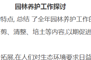 園林養(yǎng)護工作探討 摘要根據(jù)各個季節(jié)的特點, 總結(jié) 了全年園林養(yǎng)護工作的要點,包括灌水、防治病蟲害、修剪、清整、培土等內(nèi)容,以期促進園林養(yǎng)護工作的開展。