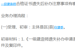 一級(jí)建造師合格證書遺失后補(bǔ)辦注意事項(xiàng)有哪些,下面建筑網(wǎng)為大家簡(jiǎn)單介紹。 業(yè)務(wù)辦理流程: (一)受理、初審:主體是區(qū)(縣)住建委。 初審材料:1.《一級(jí)建造師遺失補(bǔ)辦申請(qǐng)表》;2.申請(qǐng)人本