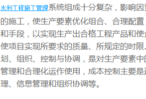 水利工程施工管理系統(tǒng)組成十分復(fù)雜,影響因素多變。水利工程施工項(xiàng)目管理的目標(biāo)是組織高效益的施工,使生產(chǎn)要素優(yōu)化組合、合理配置,保證施工生產(chǎn)的均衡性,利用現(xiàn)代化的管理技術(shù)和手段,以實(shí)現(xiàn)生產(chǎn)出合格工程產(chǎn)品和使企業(yè)獲得良好的綜合效益。建筑施工項(xiàng)目管理是為使項(xiàng)目實(shí)現(xiàn)所要求的質(zhì)量、所規(guī)定的時(shí)限、所批準(zhǔn)的費(fèi)用預(yù)算所進(jìn)行的全過程、全方位的規(guī)劃、組織、控制與協(xié)調(diào),是對(duì)生產(chǎn)要素中的勞動(dòng)力、材料、機(jī)械設(shè)備