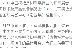 2019中國(guó)模板及腳手架行業(yè)的領(lǐng)軍展會(huì)——“第十一屆中國(guó)(北京)建筑模板、腳手架施工技術(shù)及產(chǎn)品設(shè)備展覽會(huì)(BTSE北京模板及腳手架展)”將于2019年3月15-17日在北京·中國(guó)國(guó)際展覽中心(老國(guó)展)隆重舉辦。 BTSE中國(guó)(北京)建筑模板、腳手架施工技術(shù)及產(chǎn)品設(shè)備展覽會(huì)是由中國(guó)模板腳手架協(xié)會(huì)、中國(guó)國(guó)際展覽中心集團(tuán)公司聯(lián)合主辦的行業(yè)最具規(guī)模和影響