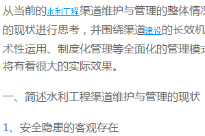 從當前的水利工程渠道維護與管理的整體情況來看,在加強人性化管理的同時,針對整個發(fā)展的現(xiàn)狀進行思考,并圍繞渠道建設的長效機制構(gòu)建全方位的考核、獎勵、懲處機制,形成技術性運用、制度化管理等全面化的管理模式,更好的發(fā)揮出水利工程渠道建設的長遠效用,將有著很大的實際效果。 一、簡述水利工程渠道維護與管理的現(xiàn)狀