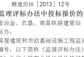 贛建招標[2013]12號 關于執(zhí)行監(jiān)理評標辦法中投標報價的有關說明 各設區(qū)市招標辦,省冶金、農(nóng)墾、南昌鐵路建管站(辦),南昌高新(經(jīng)濟)開發(fā)區(qū)招標辦: 根據(jù)《江西省房屋建筑和市政基礎設施工程監(jiān)理招標