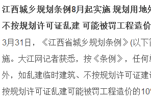 江西城鄉(xiāng)規(guī)劃條例8月起實施 規(guī)劃用地外禁設城市新區(qū) 不按規(guī)劃許可證亂建 可能被罰工程造價的10% 3月31日,《江西省城鄉(xiāng)規(guī)劃條例》(以下簡稱《條例》)獲得通過,自2010年8月1日起實施。大江網(wǎng)記者獲悉,按《條例》,任何單位和個人都有權查詢建設活動是否符合規(guī)劃。此外,如亂建臨時建筑、不按規(guī)劃許可證建設工程或不驗線就開建房