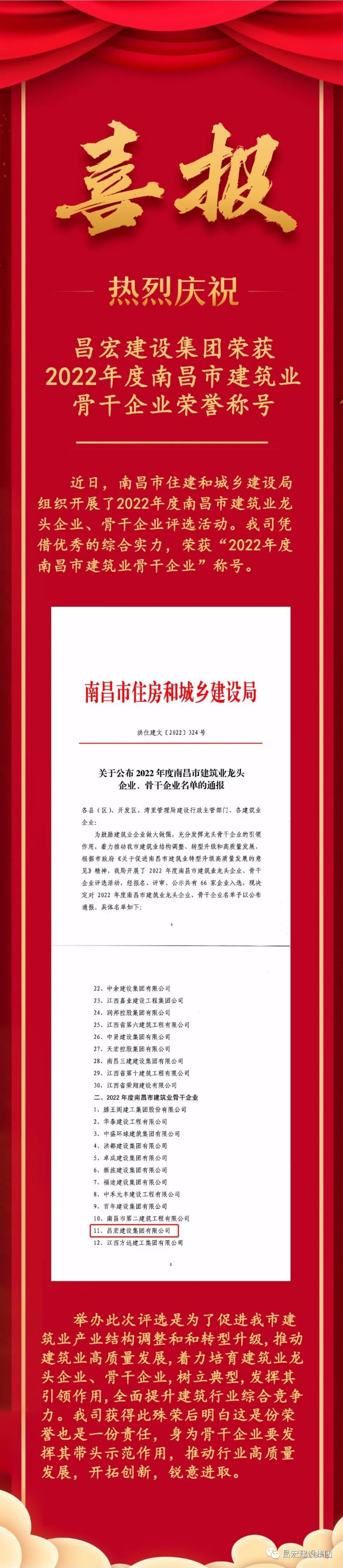 昌宏建設集團榮獲南昌市建筑業(yè)骨干企業(yè)稱號!