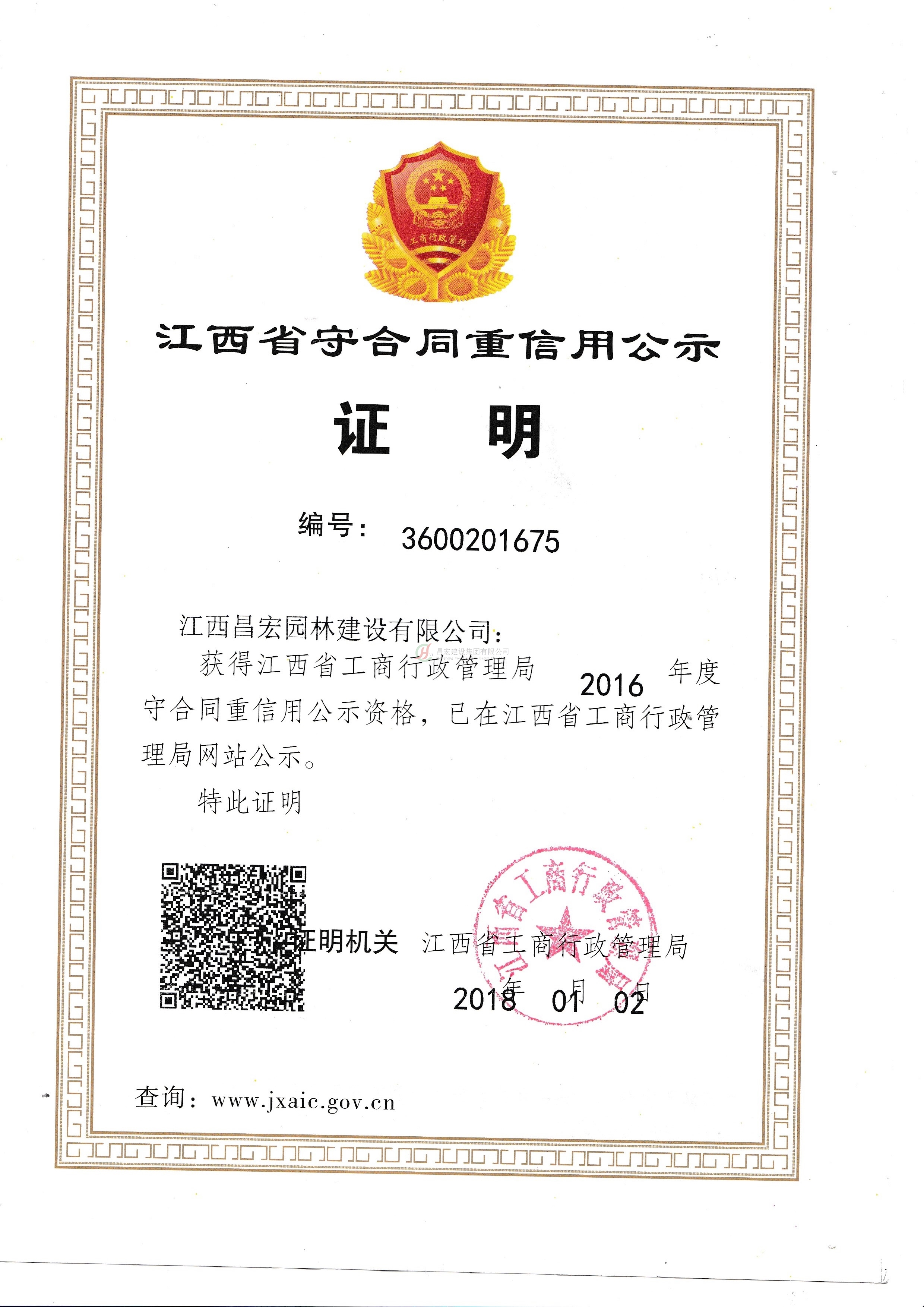 2016年度江西省守合同重信用公示證明