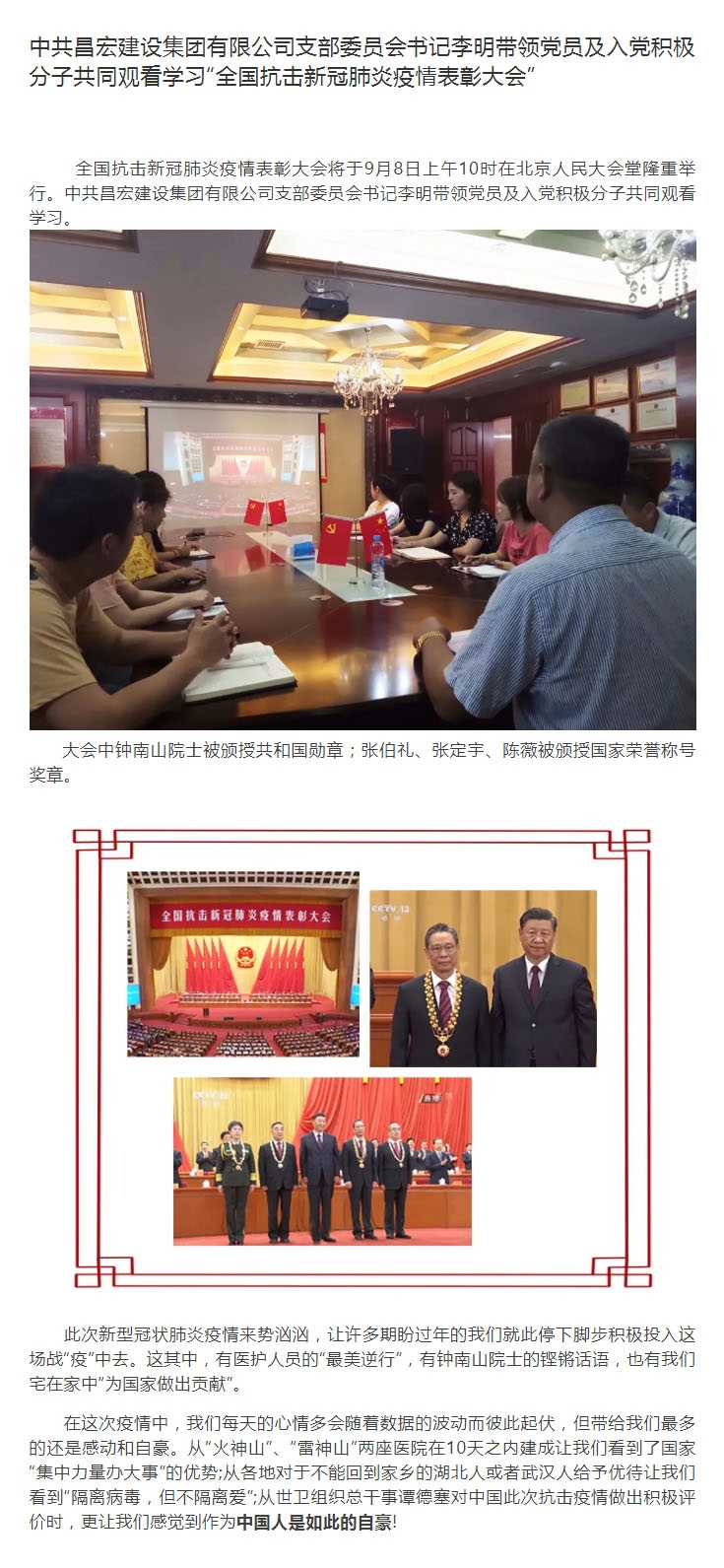 中共昌宏建設集團有限公司支部委員會書記李明帶領黨員及入黨積極分子共同觀看學習“全國抗擊新冠肺炎疫情表彰大會”